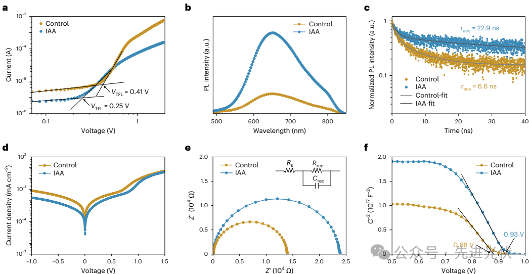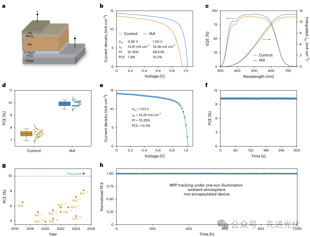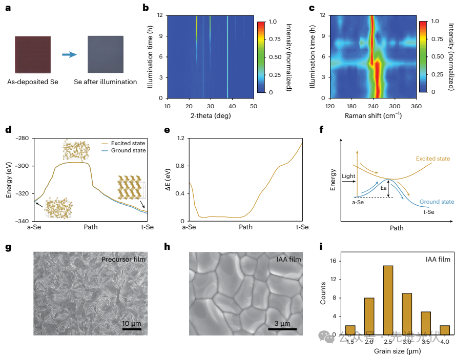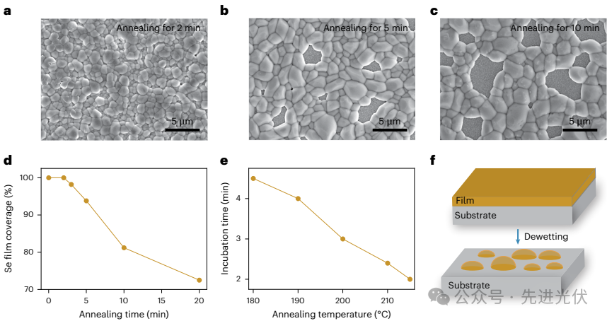 薛丁江研究员、万立骏院士与新加坡国立大学侯毅教授合作,揭示了非晶硒的光致结晶机理,并基于此提出了一种光照辅助退火新策略。该策略在室温条件下通过光照诱导非晶硒结晶,有效抑制了薄膜去润湿;再结合后续热退火处理,成功制备出具有大晶粒尺寸(约2.7 μm)、低缺陷态密度(6.9×10¹⁴ cm⁻³)和长载流子寿命(22.9 ns)的高质量硒薄膜。基于该薄膜构筑的硒太阳能电池实现了10.3%的认证光电转换效率,开路电压达1.03 V,首次实现该类电池效率突破10%、开路电压超过1 V。未封装器件在环境条件下经历1000小时最大功率点追踪测试后,性能衰减可忽略不计,展现出优异的稳定性。 硒作为世界上首个固态光伏材料,开启了现代光伏技术的新纪元。然而,其1.9 eV的带隙对于单结太阳能电池而言过宽,加之硅基太阳能电池的迅速发展,硒电池曾一度衰落。近年来,随着叠层电池与室内光伏对宽带隙吸收层材料的需求,本征宽带隙硒材料重新受到关注。硒还具有低温加工优势(结晶温度约121 oC),易于实现与多种底电池兼容的硒顶电池。该材料还展现出优异的本征稳定性:类镧系收缩效应赋予其空气稳定性,非极性硒硒键提供湿度稳定性,光伏相(三方硒)恰为其热力学最稳定物相。此外,硒作为人体必需微量元素,在低剂量下绿色无毒,满足光伏应用的安全要求。然而,目前硒太阳能电池的光电转换效率仍不理想,主要瓶颈在于传统热退火制备的硒薄膜晶粒尺寸小(约500 nm),造成严重的非辐射复合损失,导致载流子寿命短、漏电流大,从而限制了电池的开路电压和填充因子。因此,开发大晶粒高质量硒薄膜制备方法,是提升硒太阳能电池性能的关键。 本研究揭示了硒薄膜晶粒生长受限的关键因素:非晶硒薄膜在退火过程中极易发生去润湿,严重缩短了有效退火时间,从而阻碍晶粒的进一步长大。通过界面能相关计算发现,其根本原因在于硒与常见基底(如ZnMgO等)之间存在的较高界面能。 本研究提出了光照辅助退火(IAA)策略,通过室温光诱导结晶有效抑制硒薄膜高温退火时的去润湿,突破了晶粒生长的限制。该策略成功制备出具有超大晶粒(~2.7 μm)、低缺陷态密度(6.9×1014 cm-3)和高载流子寿命(22.9 ns)的高质量硒吸收层。 基于高质量IAA硒薄膜制备的硒太阳能电池获得了10.3%的认证光电转换效率,这是目前硒太阳能电池的最高纪录。尤为关键的是,其开路电压达1.03 V,首次突破1 V。未封装器件在环境条件下连续最大功率点跟踪1000小时后性能无明显衰减,展现了硒太阳能电池的优异稳定性。要点:揭示了限制硒薄膜晶粒生长的核心问题:固态薄膜在退火过程中的去润湿。随着退火时间的延长,薄膜由初始的致密连续状态逐渐转变为多孔洞状态,最终演化形成孤岛。进一步研究表明,退火温度越高,去润湿的起始时间越短。这些发现为深入理解固态薄膜去润湿的机制提供了重要依据。图2. 硒薄膜的光致结晶机理研究及IAA策略薄膜表征要点:通过时间分辨XRD与拉曼光谱,确认了非晶硒在室温光照下向晶态硒的逐步转化。动力学模拟计算进一步揭示了硒光致结晶的微观机制:相变过程中基态与激发态存在能级交叉。光激发促使非晶硒从基态跃迁至激发态,随后在弛豫过程中经过该交叉点,最终弛豫至三方硒的基态。SEM图像对比进一步表明,采用IAA策略制备出的硒薄膜致密连续,晶粒尺寸达2.7 μm,其质量显著优于优于传统退火薄膜。要点:通过空间电荷限制电流(SCLC)、稳态/瞬态荧光光谱(PL/TRPL)及电化学阻抗谱(EIS)等表征手段,系统验证了IAA策略对硒薄膜缺陷态密度与载流子寿命的优化效果。实验结果表明, IAA薄膜的薄膜缺陷态密度仅为6.9×1014 cm-3,载流子寿命提升至22.9 ns,均为目前已报道硒薄膜的最高水平。同时,IAA器件表现出更高的复合电阻和内建电势,表明其非辐射复合受到显著抑制,载流子收集效率明显提升。要点:通过器件性能测试与稳定性评估,全面展示了IAA策略对Se太阳能电池(Glass/FTO/ZnMgO/Se/MoOx/Au)的显著提升效果。IAA器件实现了10.3%的认证效率(Voc=1.03 V,Jsc= 14.20 mA cm-2, FF= 69.53%),为当前硒太阳能电池最高效率。此外,未封装器件在最大功率点跟踪下连续工作1000小时仍保持初始效率,证明了IAA策略制备的硒太阳能电池具有良好的稳定性,为其实际应用奠定了坚实基础。 本研究揭示了硒薄膜在退火过程中因易发生去润湿而导致退火时间短、晶粒尺寸过小,进而严重制约硒太阳能电池性能提升的关键问题。针对该问题,开发了光照辅助退火策略,采用室温条件下光诱导结晶抑制薄膜去润湿,再经过热退火提升结晶度的两步法,从根本上解决了硒薄膜制备中晶粒生长与去润湿之间的矛盾。基于该策略,成功制备出晶粒尺寸约2.7 μm、缺陷态密度低至6.9×10¹⁴ cm⁻³、载流子寿命长达22.9 ns的高质量硒吸收层。基于此吸收层构筑的硒太阳能电池获得了10.3%的认证效率,开路电压突破1.03 V,且未封装器件在连续最大功率点跟踪1000小时后性能无明显衰减。该工作显著推动了硒电池在叠层电池与室内光伏等领域的发展进程。