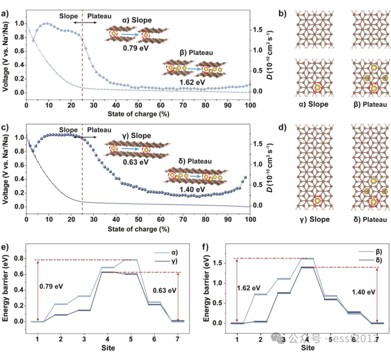 图中(a, b) 由短碳片构成的传统硬碳中Na⁺传输模型。(c, d) 连续碳片结构中的Na⁺传输模型。(e, f) 不同模型中Na⁺在各阶段的迁移能垒。注:所报告的能垒对应于示意图中标示的单个Na⁺的迁移过程