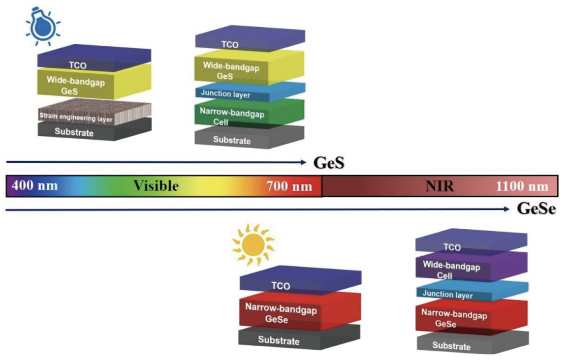 Schematic of the narrow-bandgap of GeSe used for single-junction solar cell and bottom cell in tandem solar cells, and wide-bandgap of GeS used for indoor photovoltaics and top cell in tandem solar cells (color online).