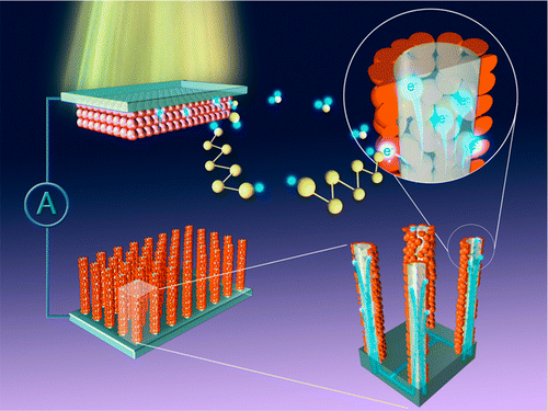 Quantum-dot-sensitized solar cell (QDSSC) has been considered as an alternative to new generation photovoltaics, but it still presents very low power conversion efficiency. Besides the continuous effort on improving photoanodes and electrolytes, the focused investigation on charge transfer at interfaces and the rational design for counter electrodes (CEs) are recently receiving much attention. Herein, core–shell nanowire arrays with tin-doped indium oxide (ITO) nanowire core and Cu2S nanocrystal shell (ITO@Cu2S) were dedicatedly designed and fabricated as new efficient CEs for QDSSCs in order to improve charge collection and transport and to avoid the intrinsic issue of copper dissolution in popular and most efficient Cu/Cu2S CEs. The high-quality tunnel junctions formed between n-type ITO nanowires and p-type Cu2S nanocrystals led to the considerable decrease in sheet resistance and charge transfer resistance and thus facilitated the electron transport during the operation of QDSSCs. The three-dimensional structure of nanowire arrays provided high surface area for more active catalytic sites and easy accessibility for an electrolyte. As a result, the power conversion efficiency of QDSSCs with the designed ITO@Cu2S CEs increased by 84.5 and 33.5% compared to that with planar Au and Cu2S CEs, respectively.