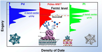 Palladium has been the focus of recent research on alternative Pt catalysts for the oxygen reduction reaction (ORR). We show that the activity and stability of Pd toward the ORR can be enhanced by Pd–O-oxides covalent bonding when Pd is supported on exfoliated montmorillonite (ex-MMT) nanoplatelets. It was experimentally observed that a thin PdOx layer with a Pd–O–MMT junction is formed at the particle/support interface. First-principle calculations further revealed that the junction is formed between the Pd atoms and the O atoms in the AlO6 octahedra of the ex-MMT. Because of the influence of the ex-MMT on the electronic structure of Pd, the electronic structure of Pd on ex-MMT is similar to that of Pt and the bonding strength of Oads is diminished. This diminished bond strength allows for the ORR on the Pd/ex-MMT to proceed through an efficient pathway, as is the case with Pt. This study opens a new pathway to modify of the electronic structure of Pd for enhanced ORR activity and stability.
