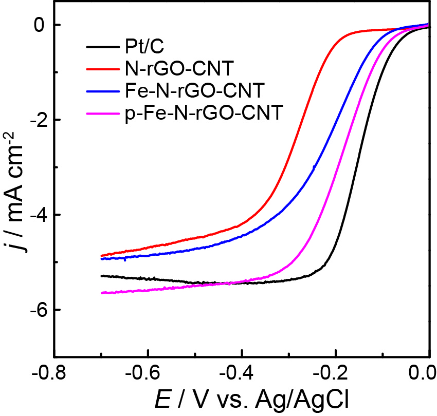 ZHANG Yun, HU Jin-Song, JIANG Wen-Jie, GUO Lin, WEI Zi-Dong, WAN Li-Jun J. Electrochem., 2014, 20, 401-409 Abstract (click image for pdf file)  Developing low-cost catalysts with high electrocatalytic activity for oxygen reduction reaction (ORR) has recently attracted much attention because the sluggish ORR currently limits the performance and commercialization of fuel cells and metal-air batteries as well. Nitrogen doped carbon materials have been considered as a promising candidate for the replacement of high-cost and scarce Pt-based catalysts although their electrocatalytic activity still needs to be much improved. In this work, an improved nitrogen-doped graphene/carbon nanotubes composite (N-rGO/CNT) was developed as an efficient ORR electrocatalyst. It was found that the ORR activity of N-rGO/CNT composite could be significantly enhanced by introducing iron in nitrogen-doping process, and further boosted by constructing nanopores in catalysts for allowing more catalytically active sites accessible and enhancing mass transfer. Moreover, the electrochemical measurement showed that the improved catalysts exhibited superior tolerance to methanol crossover and durability, indicating their potential as ORR catalysts for energy conversion and storage applications.