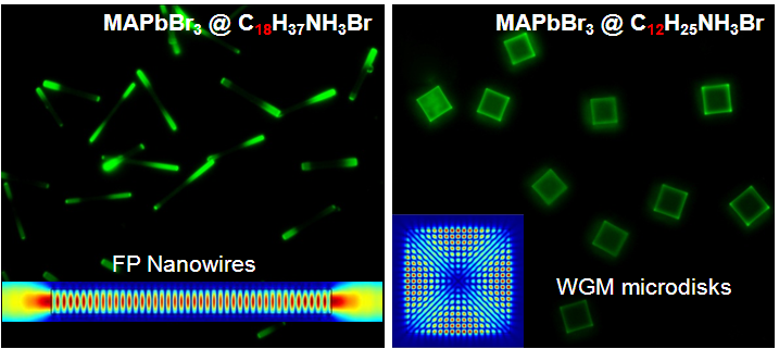 Low-threshold two-photon-pumped (TPP) perovskite microcavity lasers are achieved in crystal perovskite 1D or 2D microstructures fabricated through a liquid-phase self-assembly method assisted by two distinct surfactant soft templates. The lasing actions from the perovskite materials exhibit a shape-dependent microcavity effect, which is subsequently utilized for the modulation of the lasing modes and for the achievement of two-photon-pumped single-mode perovskite microlasers.