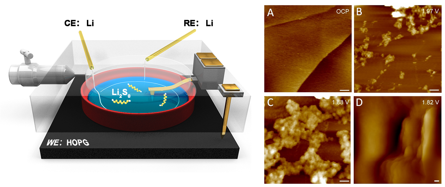 在锂硫电池中,硫电极界面的充放电过程复杂,包括硫的开环以及多种多硫化物之间的相互转化。界面过程的复杂性使其成为锂硫电化学研究的瓶颈与难点,目前对于界面过程,尤其是在纳米尺度上的中间产物的形态,反应机理等的认识尚浅,而界面过程是锂硫电池研究的重要基础科学问题之一,存在直接的结构-性能相关性。原位成像是一种直观高分辨的研究手段,可以实时监测界面动力学行为以及微观结构演变规律。我们的工作选择采用原位AFM的方法,进行锂硫电化学反应界面动力学过程的原位监测与表征。