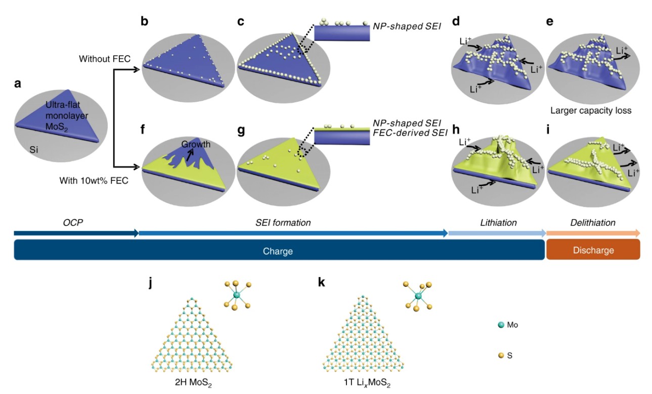在锂电池研究体系中,固体电解质界面(SEI)膜形成机理和界面动力学行为一直是具有挑战性的难点问题。SEI膜不导电子但能保证锂离子顺利通过,高质量的SEI膜被认为能够有效保护电极避免副反应以及抑制锂枝晶的形成。氟代碳酸乙烯酯(FEC)作为一种电解液添加剂被广泛地用于锂电池体系中,被认为可以诱导SEI膜的形成从而有助于电池性能的改善。然而,电解液添加剂诱导SEI形成的微观机制与表面效应尚不清晰。二硫化钼(MoS2),因其具有较高的理论比容量(~670 mA·h/g)、适合碱金属离子(Li+, Na+, K+)传输的二维层状结构(层间距约为0.65 nm)以及广泛的应用,被认为是最具前景的负极材料之一。因此,利用超平大面积单分子层MoS2电极材料的优势,构筑一个近乎完美的机理研究平台应用于原位电化学原子力显微镜(EC-AFM)成像研究,有望实现对于电极/电解液界面电化学过程的实时监测,发现并理解SEI膜形成初期的形貌、成核电位、生长速率、化学组分及其在循环过程中的演化规律,有利于深入理解锂离子电池表界面的相关基础科学问题,对于锂电池界面稳定工程以及电池材料的优化设计具有重要意义。