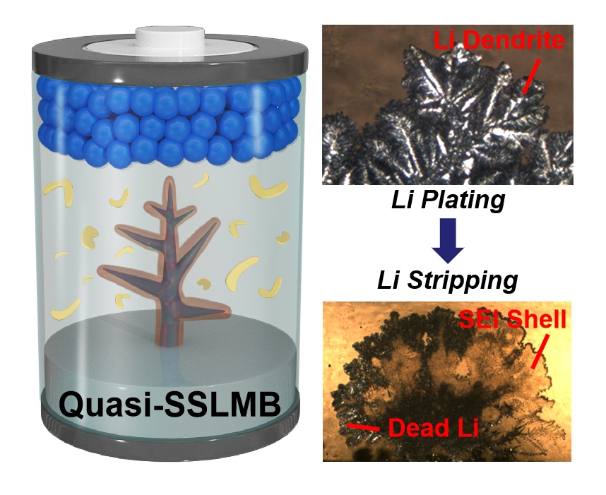 图1. 准固态金属锂电池中锂枝晶及其SEI层的结构示意图。