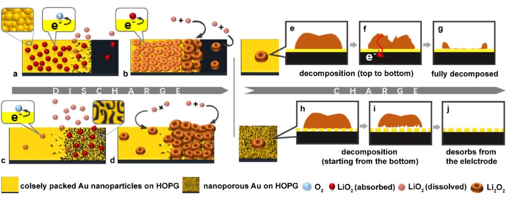 图1:纳米金电极催化锂氧界面反应过程示意图