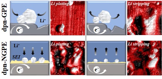 本工作利用原位电化学原子力显微镜(in situ EC-AFM)探究了在基于不同凝胶电解质体系的准固金属锂电池(QSSLMBs)中金属锂负极在充放电过程中的动态界面演化过程,揭示了GPE基电解质改性诱导形成的氮化界面对电极过程的调控与优化机制。在含有硝酸锂(LiNO3)电解质添加剂的GPE体系中,在线监测到了一层无定形SEI膜覆盖于锂金属电极表面,而后诱导块状沉积锂致密均匀地成核与生长。LiNO3电解质添加剂对于电解质的改性,有效地抑制了金属锂负极表面因不均匀应力释放而产生的孔洞状缺陷,有效改善了金属锂在锂电极表面沉积的动力学过程,阐明了LiNO3添加剂调控氮化界面生成以及均匀化锂沉积/溶解过程的界面微观机制。上述研究结果有利于深入理解QSSLMBs表界面的基础科学问题,并指导电池体系的界面修饰与结构设计,为GPE基准固态金属锂电池性能的提升提供实验依据与优化策略。该成果近期发表在《Journal of Energy Chemistry》上。