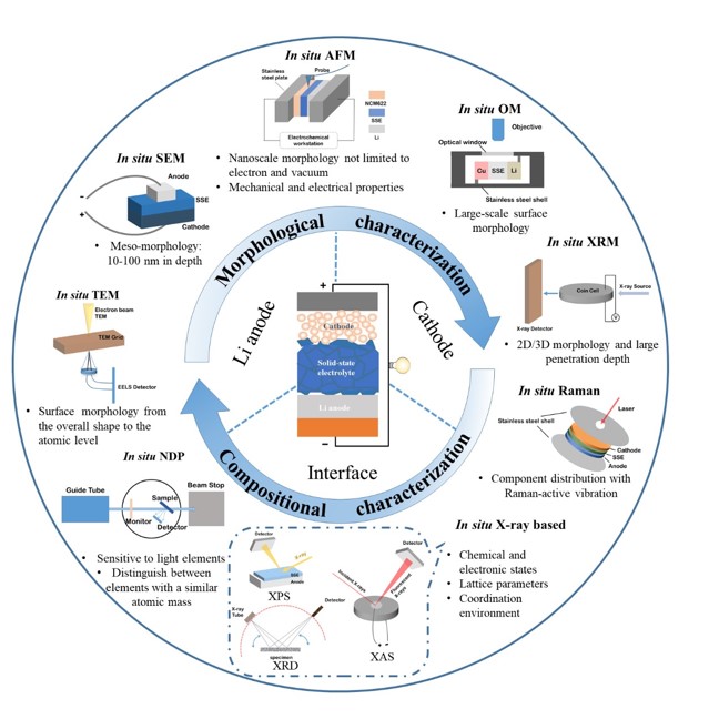 近几年, 伴随着先进表征技术的发展, 使得界面研究成为可能, 固态电池内在反应机理的深入研究也因此取得了一定的进展。 传统的非原位表征技术, 因后处理导致时间上的推迟, 不能提供随环境变化而变化的定性、定量信息, 所以有必要发展在不同时间、空间尺度下的原位表征技术, 以实时监测电池微观结构的转变和离子扩散的演变过程。本综述系统地介绍了近几年原子力显微镜、电子显微镜、 X 射线显微镜等成像表征技术和拉曼光谱、 X-ray 基技术、中子深度分析等成分分析技术的原位研究进展。 重点分析了各类表征技术在 SSLBs 循环过程中形貌和组分的演化, 包括正极材料的相变、形变, 金属锂的沉积/溶解、锂枝晶生长, 固态电解质结构演化和电极/电解质界面相的形成, 进一步加深了对固态锂电池的理解。 该成果近期发表在《ACTA CHIMICA SINICA》上。