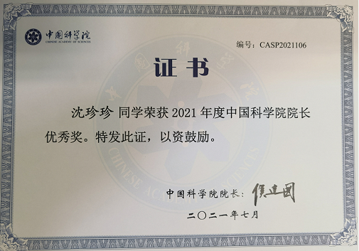 祝贺沈珍珍同学荣获2021年度中国科学院院长优秀奖!